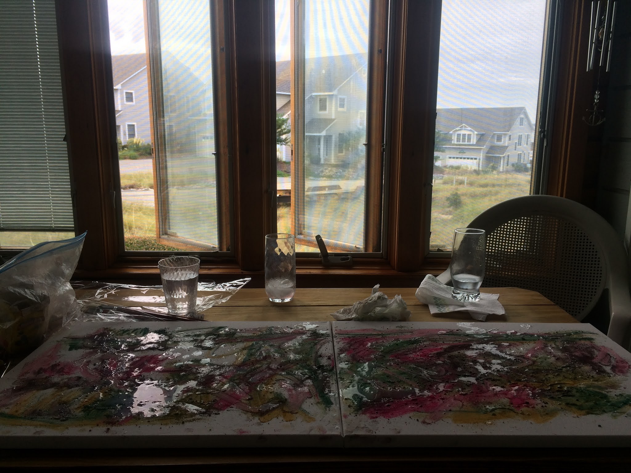 In 2017 at the Outer Banks in North Carolina in the town just before Corolla working on stretched white canvas with acrylics on a series, cheers, the process, the journey, the wonder, the wander, the gander, looking, noticing, snapping pictures at each step as the canvas dries, seeing sections and photoing them, cheers! A wonderful process, love it!