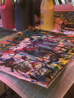 Working last summer on our deck during 2020 on my art during the Covid 19 pandemic with acrylics on stretched canvas and other found yard art materials, and lobpving it soooooo! Yay!